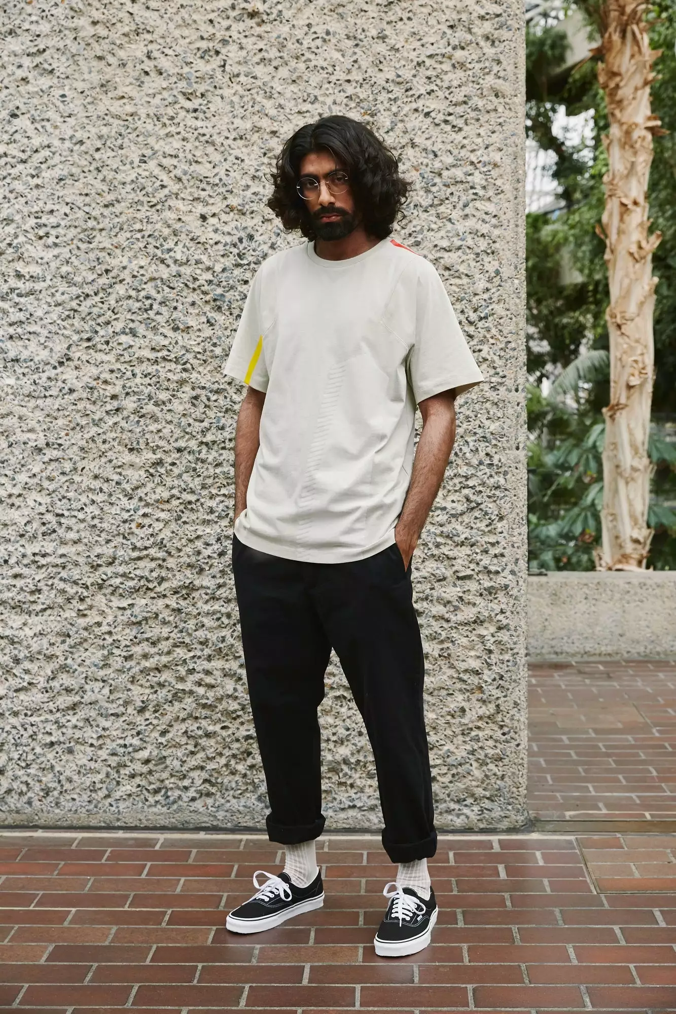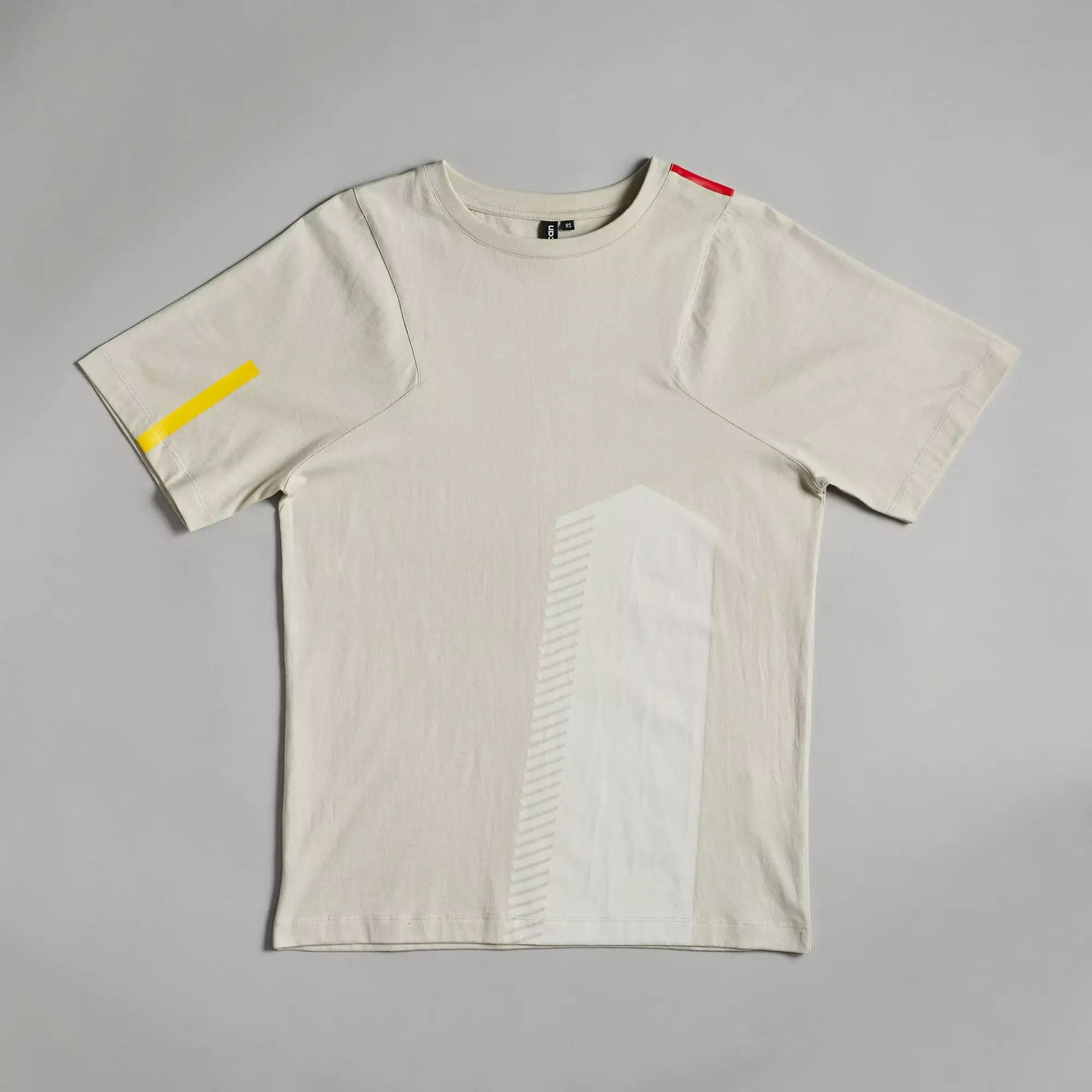 The t-shirt features a bespoke brutalist sleeve cut, a subtle nod to the legacy of Bauhaus modernism. Beige grey inspired by the estate’s concrete is foregrounded by the towers in print.