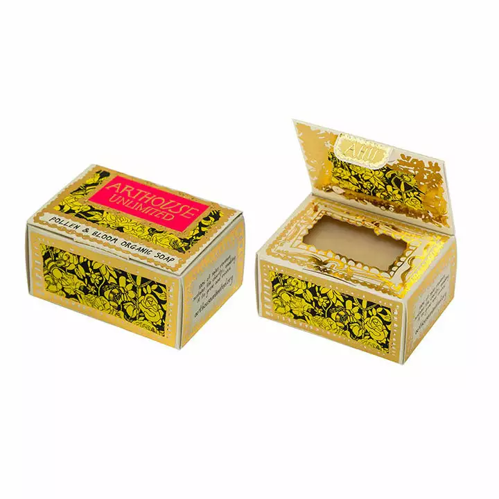 This luxurious soap is presented in dazzling gold embellished packaging.