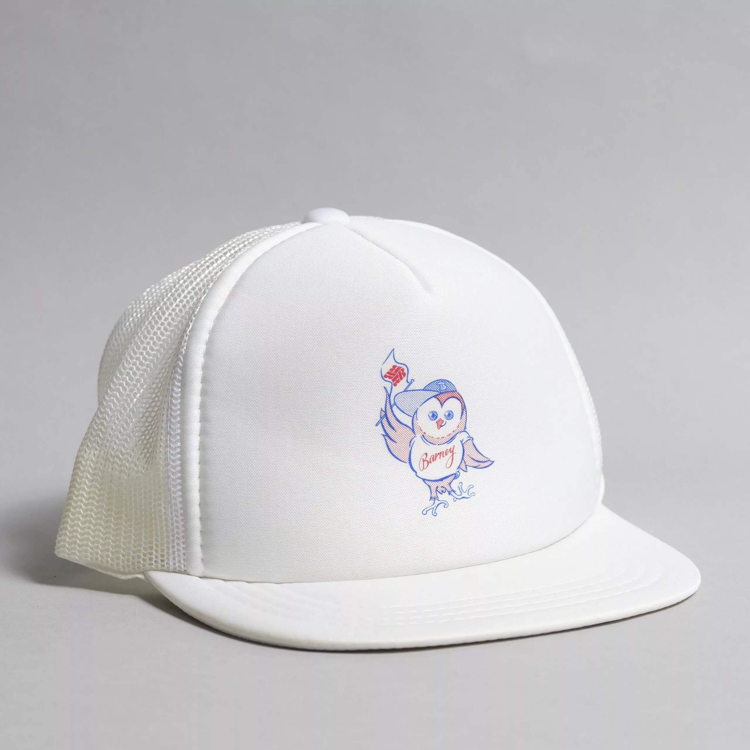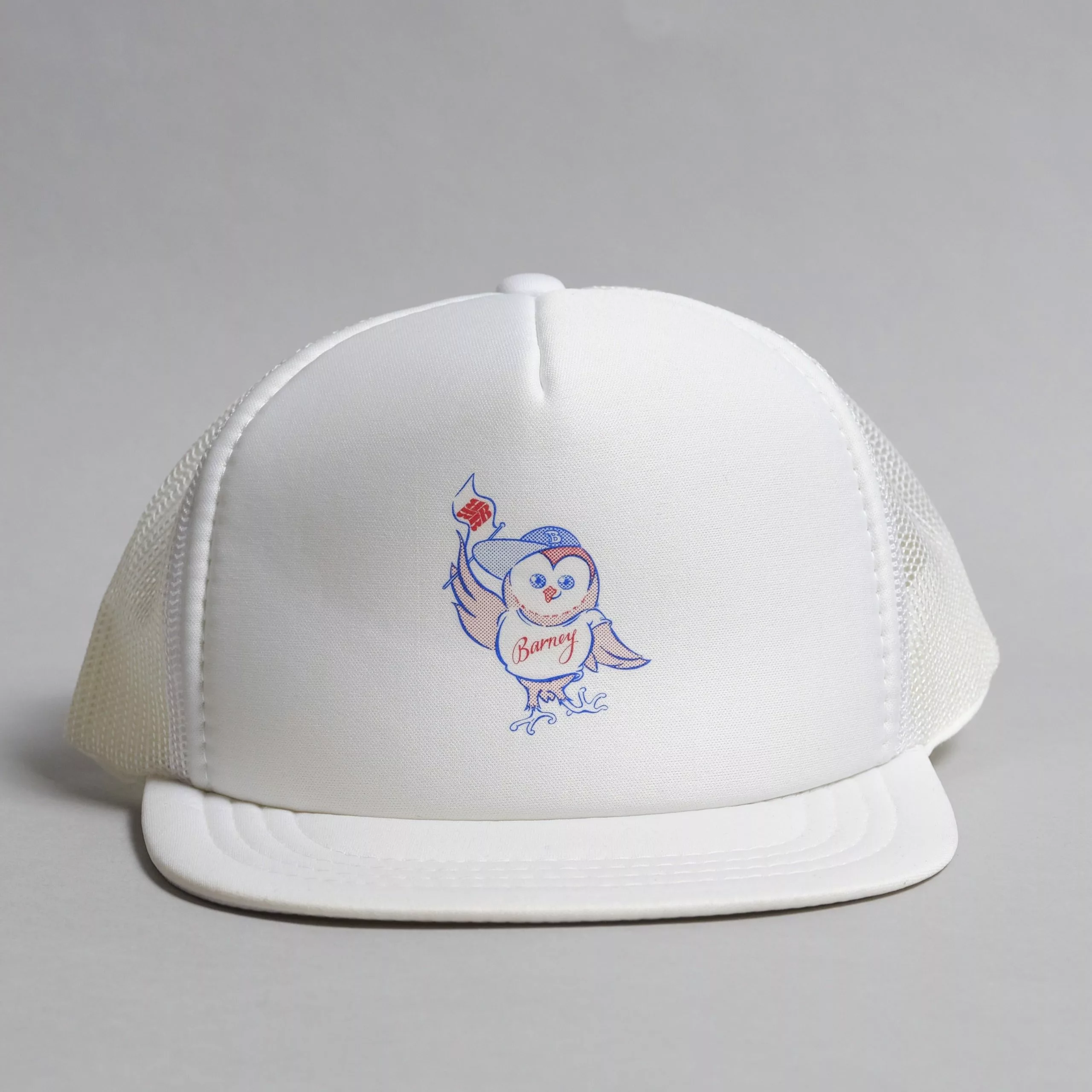 The cap is a piece of vintage Barbican design, featuring the old Barbican logo and ‘Barney the Barn Owl’ himself.