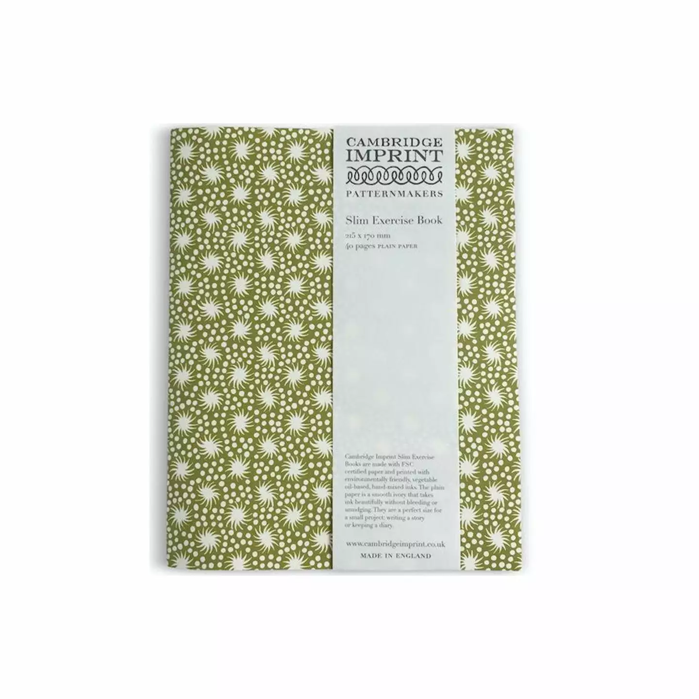 Cambridge Imprint Slim Exercise Books are modelled on old-fashioned school exercise books. They have covers of heavy, 170 gsm patterned paper, without any text or logo, and inside there are forty pages of plain 90gsm ivory paper.