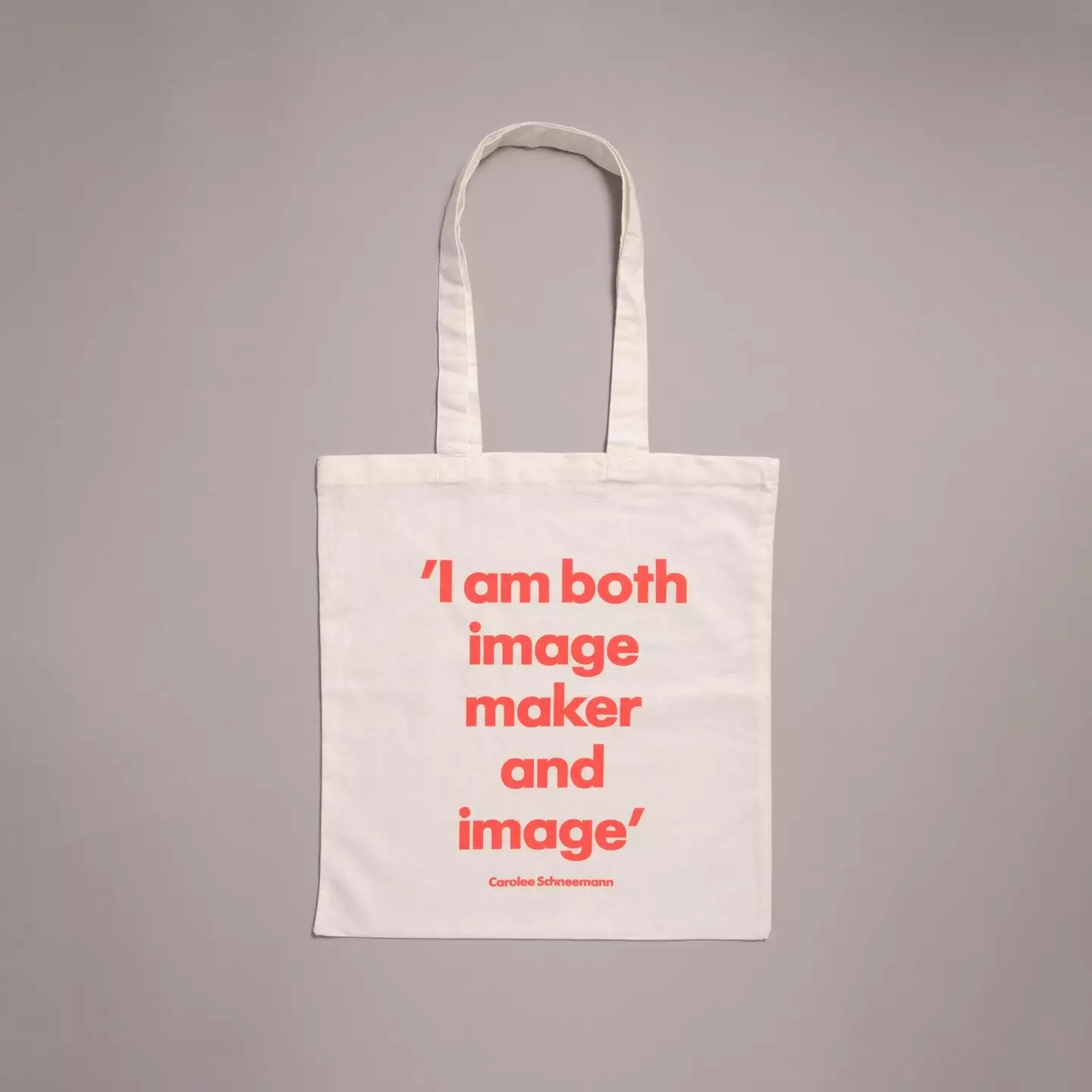 Lightweight 5oz cotton shopping bag, printed on one side with the quote, ‘I am both image maker and image,’ by artist Carolee Schneemann.