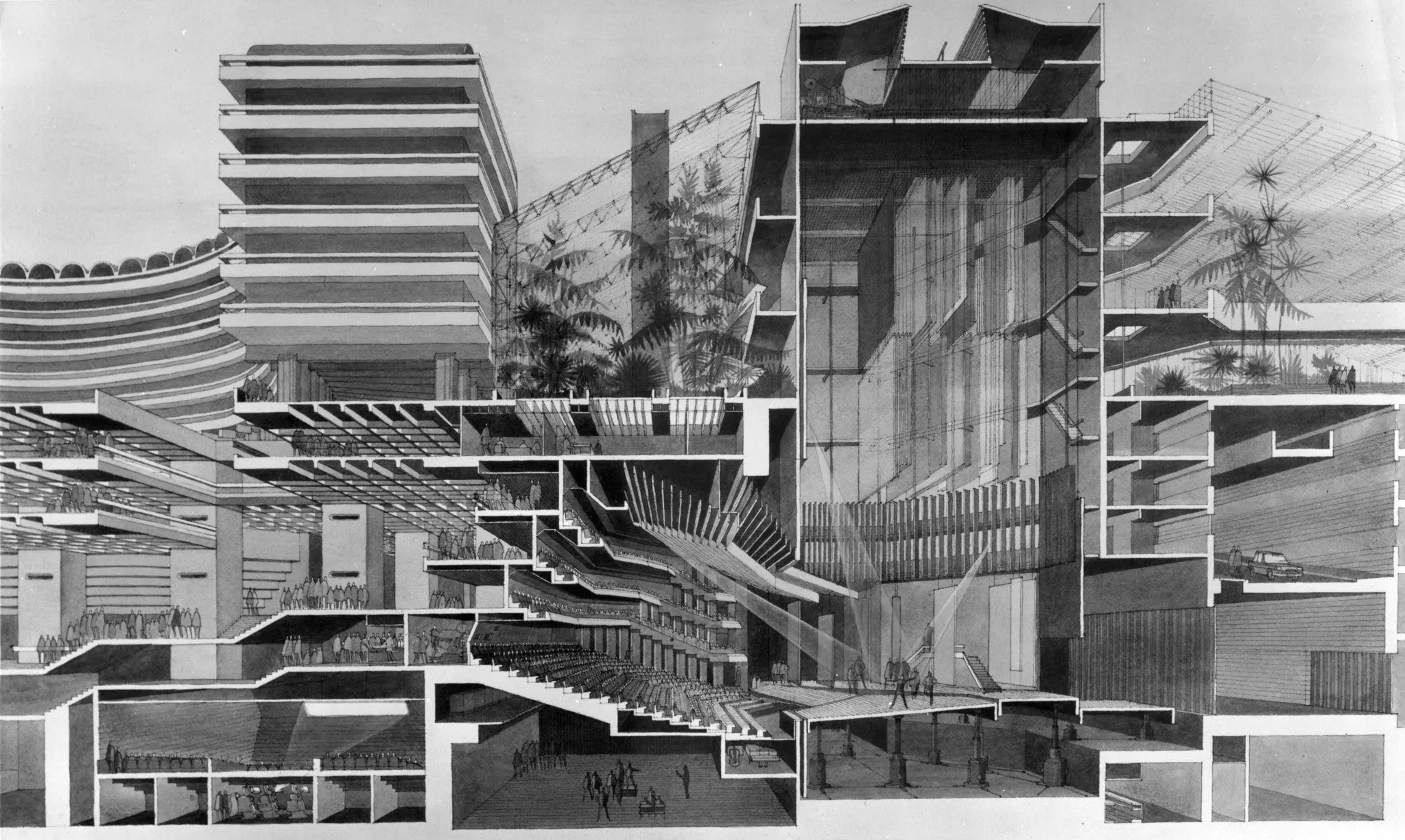 This extraordinary image from our archives depicts a cross section of the Barbican Centre, as designed by Chamberlain, Powell & Bon (1965-1976).