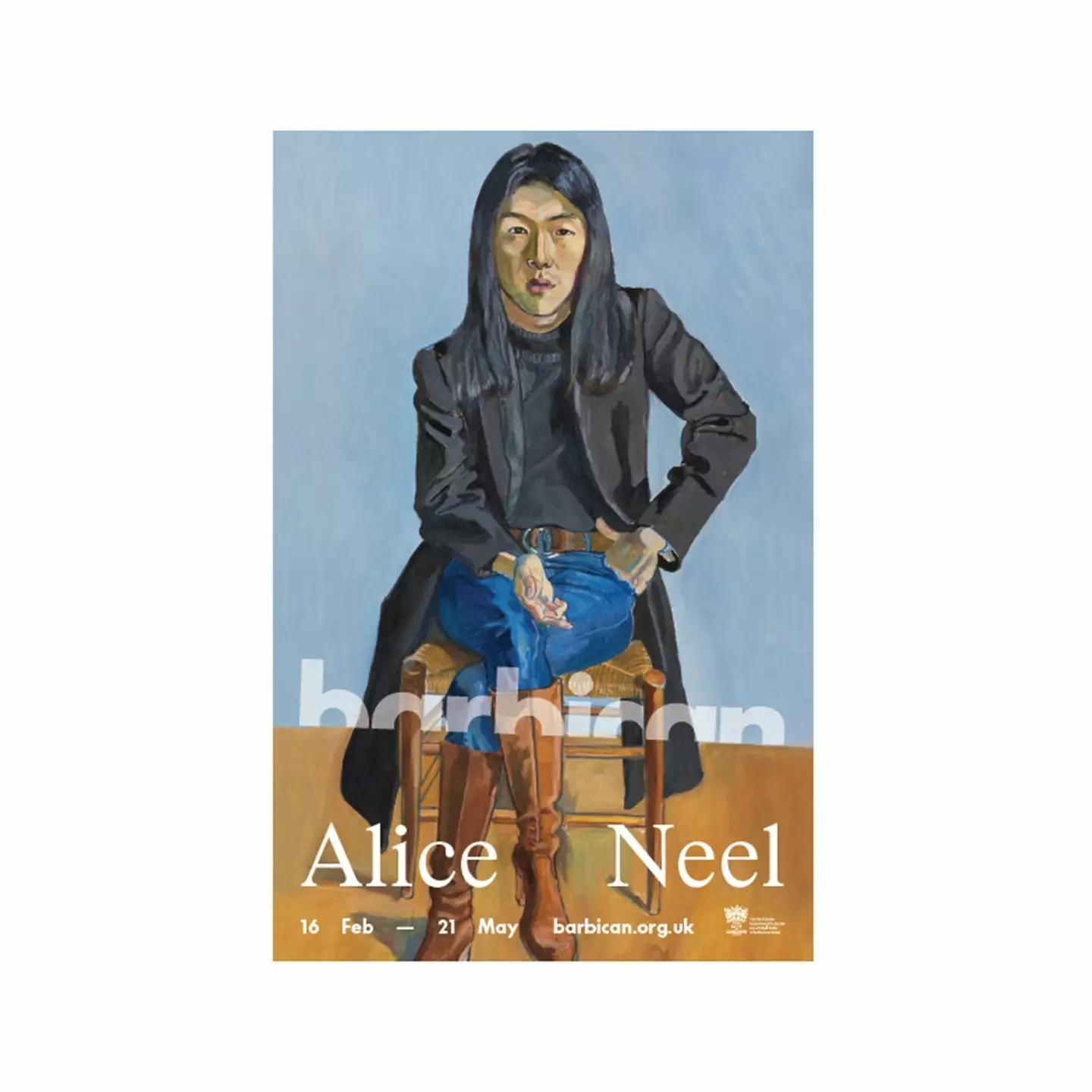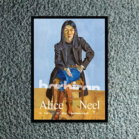 Official poster for the art exhibition Alice Neel: Hot Off The Griddle which is showing at the Barbican from 16 February to 21 May 2023.