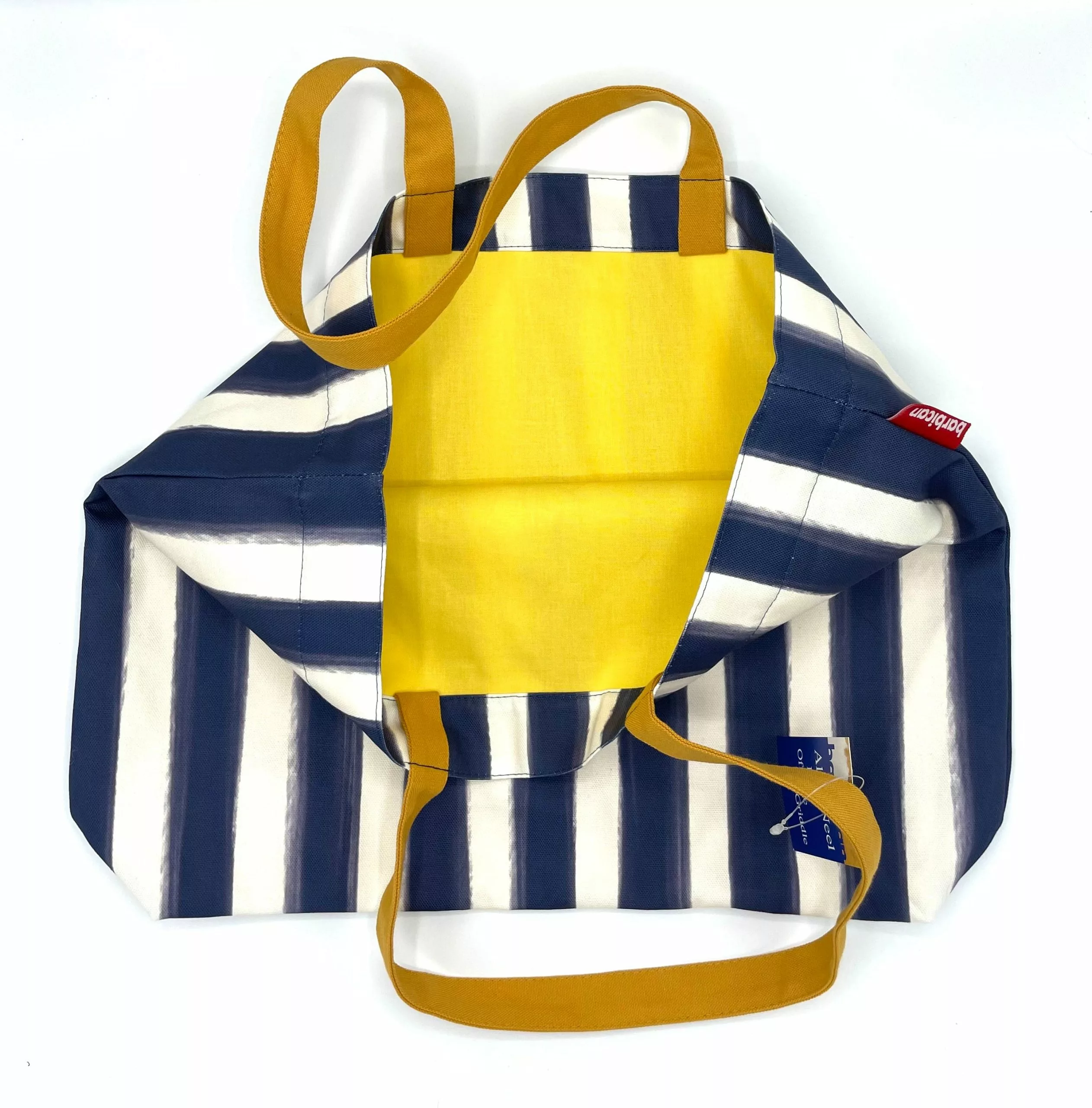 Edge to edge custom printed large tote bag with a bespoke painted navy stripe print inspired by the armchair used by painter Alice Neel as a recurring prop in her portrait paintings of the 1970s and 1980s.